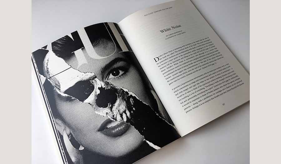 The book features twenty-two stories, sequences of poetry and critical essays by fourteen graduates for The Cass’s English Literature & Creative Writing courses. Each piece has been illustrated by a Graphic Design BA or Illustration and Animation BA student from Ellipsis studio in Visual Communication. And the whole book has been designed, typeset and produced by Ellipsis studio, with Carlos Valencia acting as lead designer, and a cover designed by Karl Fitzgerald.