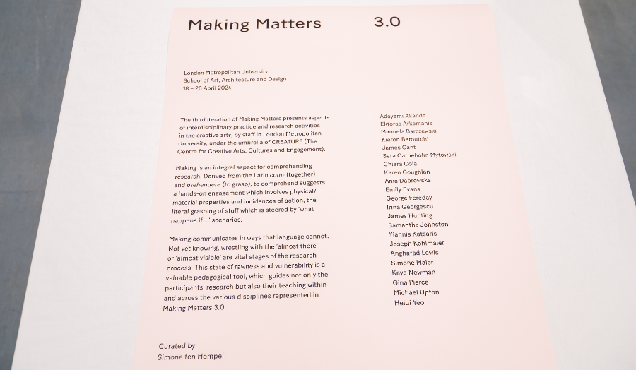 Making Matters is an annual exhibition featuring practice-based/led research from staff members of the School of Art, Architecture and Design. It offers staff with an interdisciplinary background a platform to experiment, showcase and communicate their practice research in progress. Making Matters 3.0 is the third edition of the exhibition.